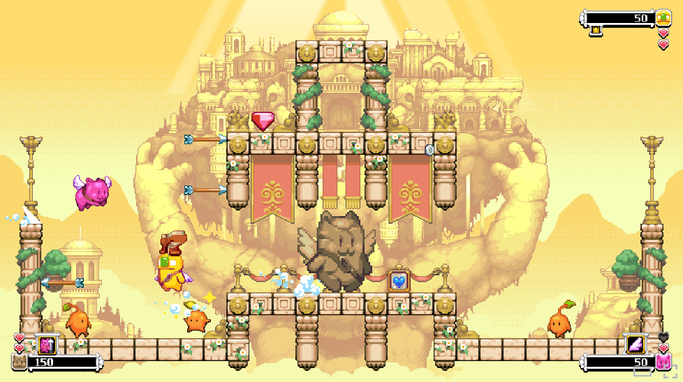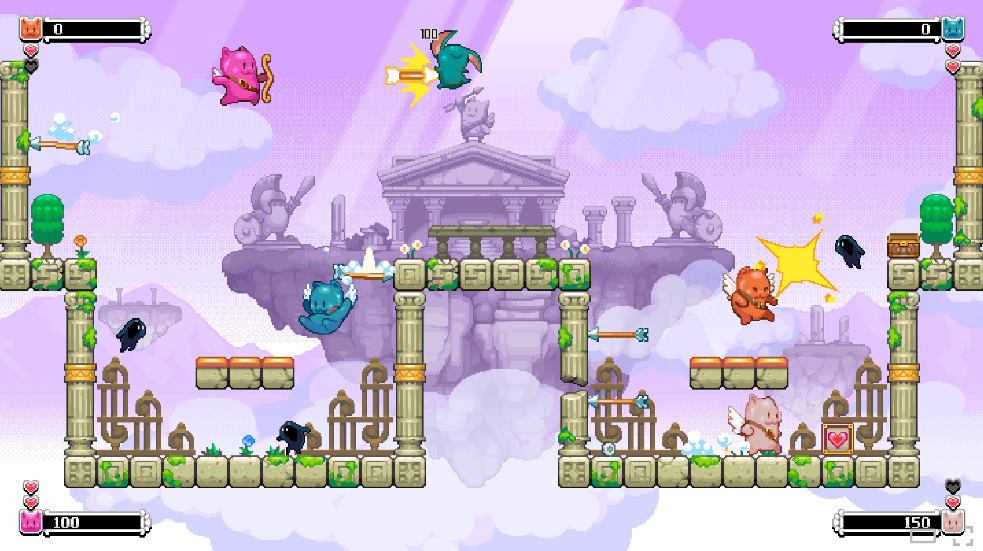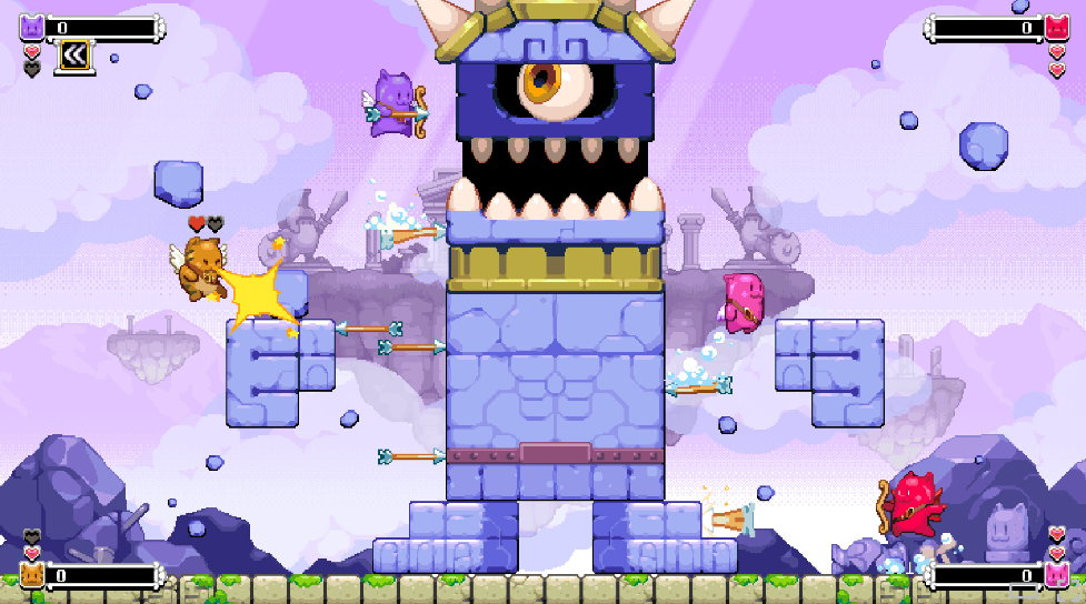 這是一款街機風(fēng)平臺跳躍射擊游戲,你將化身天使貓貓,拿起弓箭守護家園。