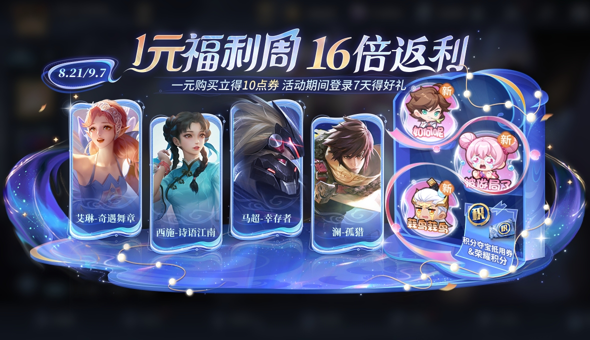 活動簡介:在活動內(nèi)1元購買10點券,登錄7天可領(lǐng)16倍返利,還可隨機獲得皮膚,全新個性表情或積分奪寶抵用券其中之一!