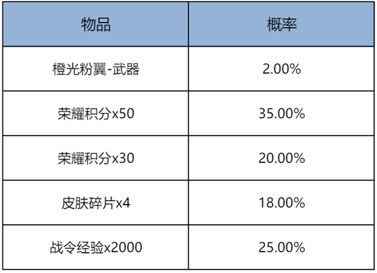購買禮包必得酷炫機甲(1日),可額外隨機獲得以下之一:榮耀積分x50、榮耀積分x30、皮膚碎片x4、戰(zhàn)令經(jīng)驗x2000、橙光粉翼-武器。累計50次必得橙光粉翼-武器。
