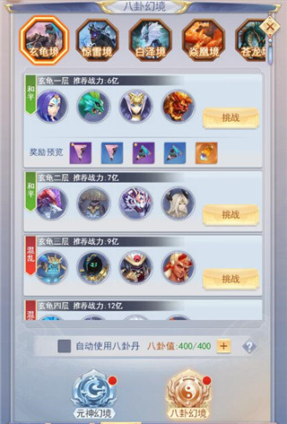 1、玩家可以前往八卦幻境獲取八卦,八卦幻境分為5個(gè)境界,每個(gè)境界需要對(duì)應(yīng)的八卦開啟后才能同步開,而每個(gè)境界共分5層,1、2兩層為和平層,3至5層為混亂層,會(huì)受到其他玩家攻擊。