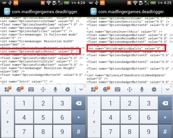 長(zhǎng)按com.madfingergames.deadtrigger2.xml文件,然后使用文本編輯器打開(kāi),將 int name="UnityGraphicsQuality" value="0" 改為int "UnityGraphicsQuality" value="3" ,同理,再將 int name="OptionsGraphicDetail" value="1" 改為 int name="OptionsGraphicDetail" value="2" ,然后保存即可。