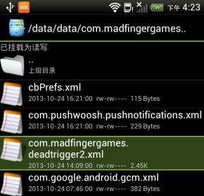 想要修改特效,首先你的設(shè)備需要已經(jīng)ROOT,然后使用文件管理器打開(kāi)手機(jī)根目錄下的:data/data/com.madfingergames.deadtrigger2/shared_prefs文件夾,這里以《RE文件管理器》為例。