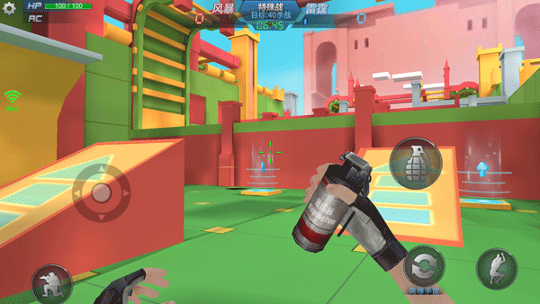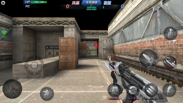 游戲畫面左下角有一個(gè)圓圈狀的虛擬按鈕,右下角有個(gè)未顯示的虛擬按鈕,玩家通過滑動(dòng)虛擬按鈕控制人物的動(dòng)作。其中左下角的虛擬按鈕控制移動(dòng)右下角的虛擬按 鈕控制準(zhǔn)星和射擊。同時(shí),在畫面左上角設(shè)置按鈕中有戰(zhàn)績(jī)查詢、游戲設(shè)置、鍵位設(shè)置功能,左下角有蹲下按鈕,畫面右側(cè)分布有跳躍、切換武器、換子彈、扔手雷 等按鈕。