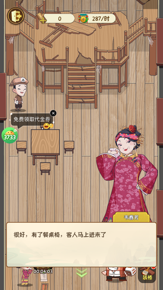 3、進(jìn)入游戲后,玩家可以前往酒樓區(qū)域,準(zhǔn)備展開經(jīng)營之路;