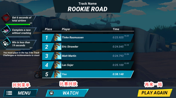 5、這里小編摔了個(gè)大跟頭,狗啃泥,得了個(gè)倒數(shù)第一。。這里可以看下剛剛的回放,或者快速再來(lái)一把!