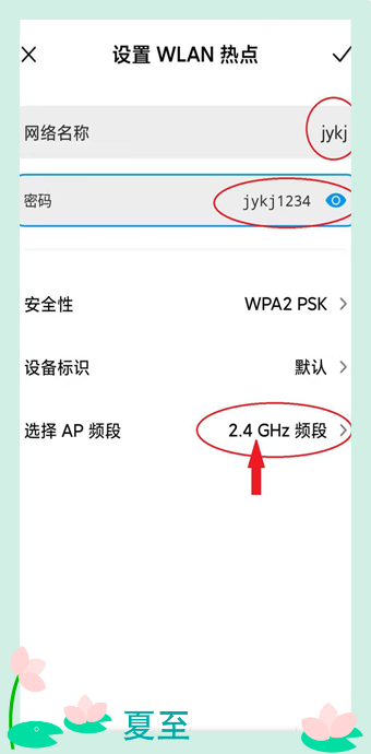 設(shè)置個人熱點。網(wǎng)絡(luò)名稱設(shè)置為jykj這四個字母,密碼輸入:jykj1234。AP頻段選擇2.4Ghz或5Ghz均可。