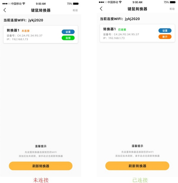 點擊連接按鈕,轉(zhuǎn)換器將連接到您的手機,此時已經(jīng)可以在云電腦/云游戲中使用鍵鼠啦~