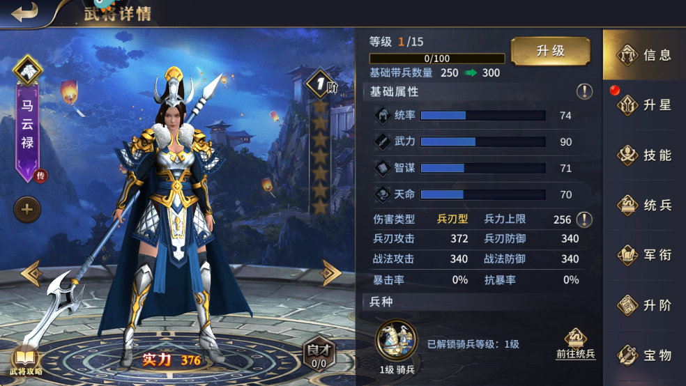 1、馬云祿,兵刃輸出型騎兵武將,主屬性武力,技能設(shè)計(jì)上專門克制盾兵,意在充分發(fā)揮騎兵的兵種特性,擊殺敵方盾兵,以取得兵力優(yōu)勢。