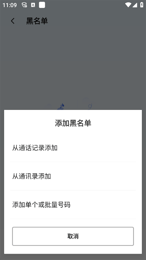 5、添加黑名單,可以從通話記錄、通訊錄、添加單個(gè)/批量號(hào)碼。