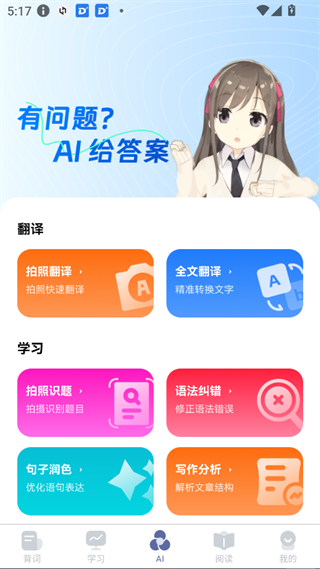 AI解答疑問,內(nèi)置翻譯、學(xué)習(xí)、練習(xí)等功能(如拍照翻譯、拍照識圖、語法糾錯(cuò))