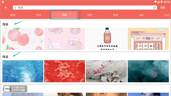4、另外,你在搜索圖片的同時,圖片大全搜圖神器還能鏈接到優(yōu)質、專輯、搜狗、百度、360、必應六大模塊里面去;